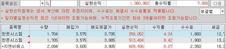 한온시스템 매매 : 당일 매매로 관심종목으로 분류해둔 자동차섹터에서 한온시스템의 가격이 튀어오르길래 일정 금액을 매입 후 바로 정리했다. NXT장에서 4,000원을 넘겼으니 여유있게 가져 가봤어도 될껄.. 확신이 없어서 그냥 털고 나왔다. NXT 강하던데 내일도 찍먹을 도전해봐야되나...?
