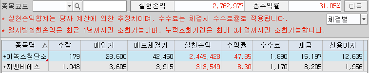 지앤비에스 에코 : 2/4일에 4,189주 X 3,605원 = 15,101,345원의 신용 매수 금액은 오늘로써 다 매도했다. 한화솔루션이 올라가면 조금 따라 가는는 것 같지만 그 힘이 너무 약하고 거래량이 없기 적고, 신용을 쓴 것이기에 종료할 수 밖에 없었다. 그래도 괜찮은 수익을 보고 마무리한 것 같다. 더 올라가면 뭐 내꺼 아닌거고...