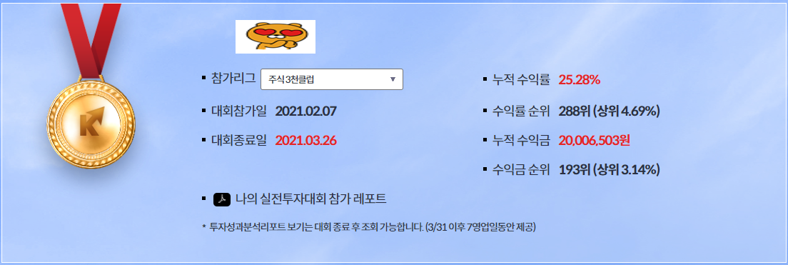 비록 처음 참가해 보는 실투대회에서 위의 수상내역에 들지는 못했지만..(아니 평생을 해도 수상내역에는 들지 못할듯...) 나쁘지 않은 성적을 거둔 것 같다...?라고 말을 하기가 참 애매하다.. 기간동안의 누적수익률은 25%로 마이너스의 내가 참가한 클럽 수익률과 대회전체수익률을 같이 놓고 비교해 보자면 잘한건 사실인데...